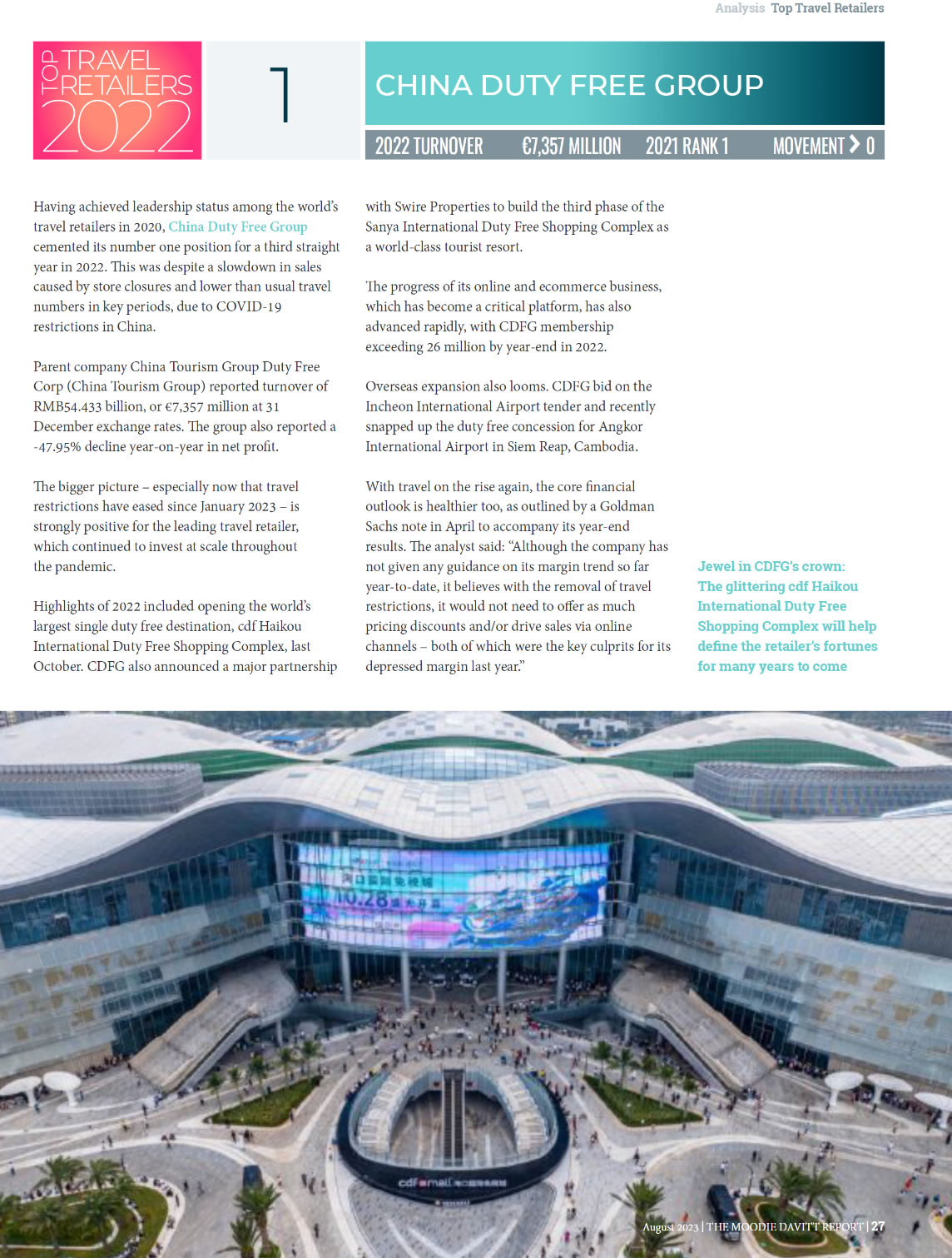 2023年8月28日,全球旅游零售行業(yè)權(quán)威媒體《穆迪達維特免稅報告》(The Moodie Davitt Report)發(fā)布《全球領先旅游零售商報告》,對過去一年來全球前20名旅游零售商展開了跟蹤評估。報告顯示,根據(jù)2022年營業(yè)額統(tǒng)計,中免集團連續(xù)第三年在全球頂級旅游零售商中保持領先地位,成為2022年全球最大旅游零售商。