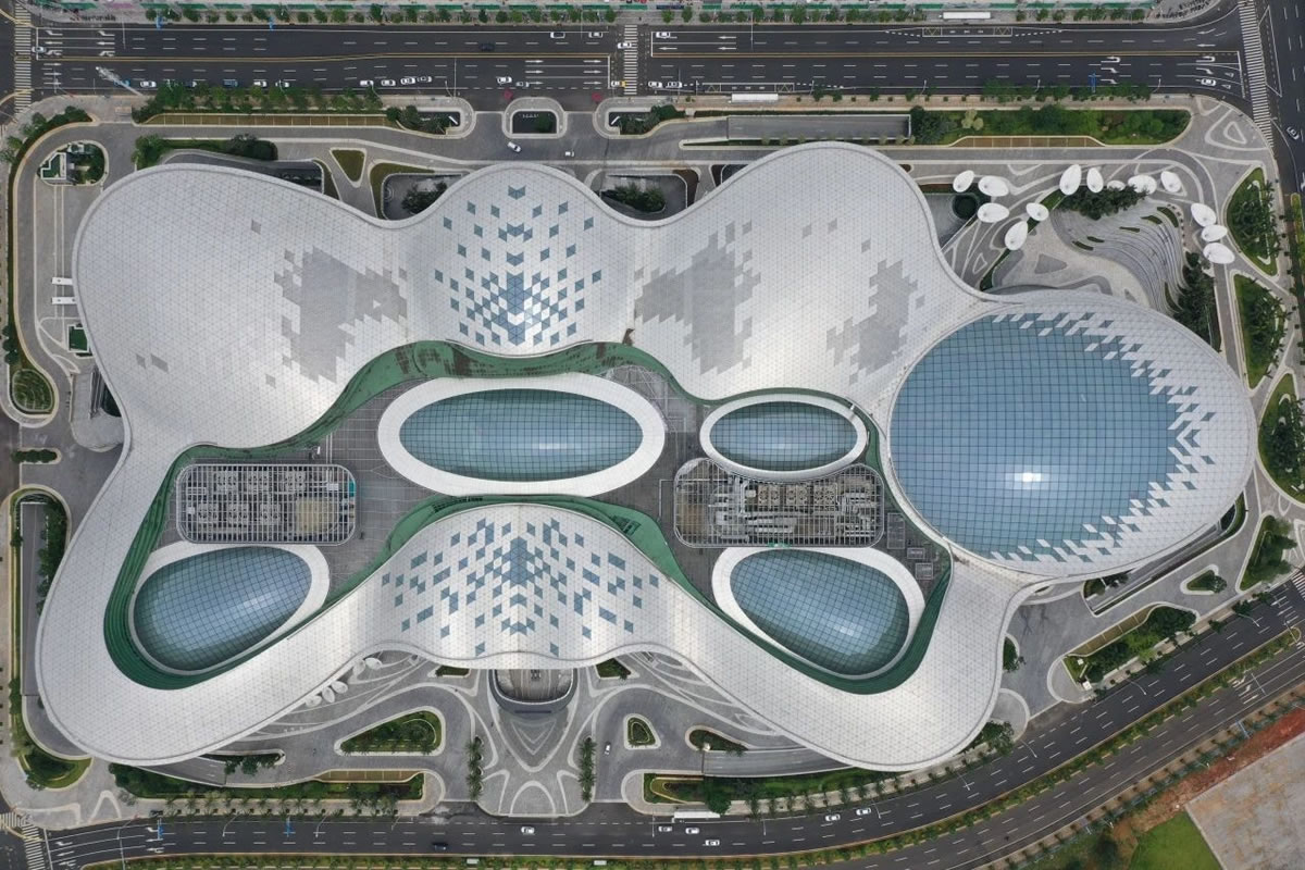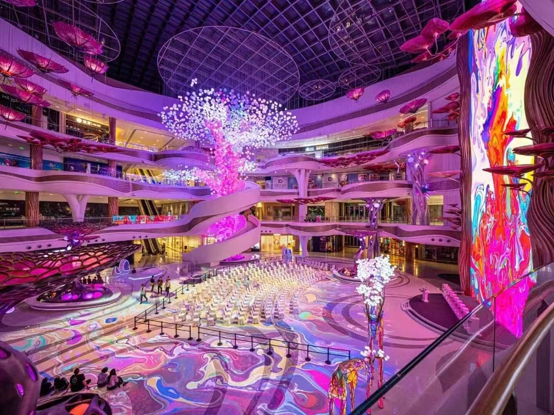 ▲??趪H免稅城項目“AURA天際秘林”中庭(攝于調試階段)