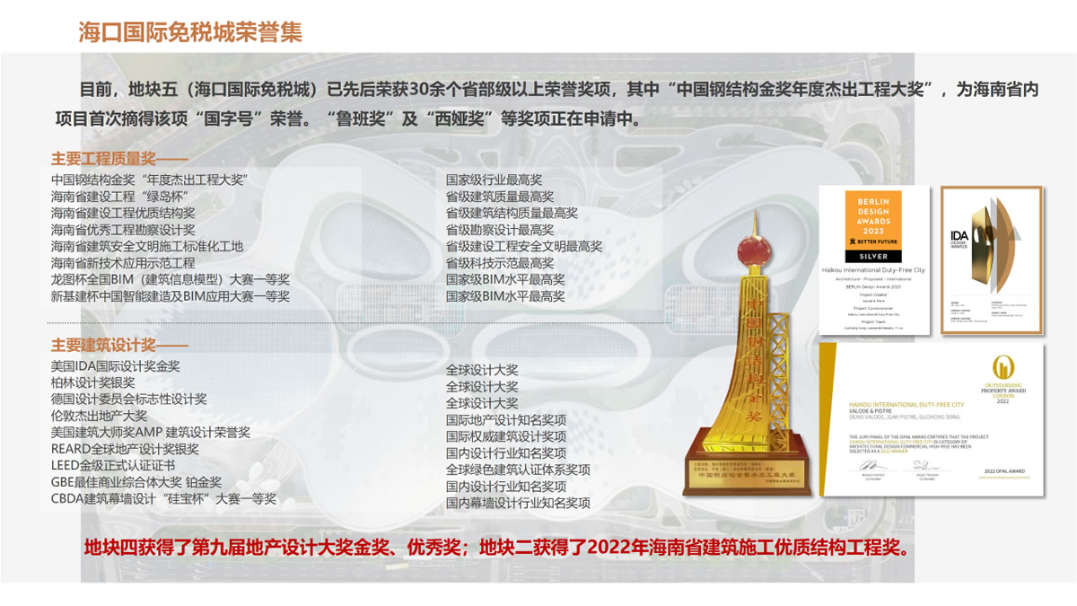 ▲ 海口國際免稅城項目整體建設所獲榮譽