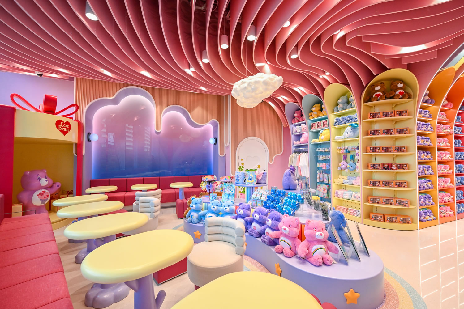 Care Bears主題咖啡店位于cdf三亞國際免稅城C區(qū)二層,以“治愈系空間”為核心設(shè)計理念,整體裝修風(fēng)格延續(xù)了品牌標(biāo)志性的彩色風(fēng)格與柔和線條,店內(nèi)墻面裝飾經(jīng)典小熊插畫,展陳小熊玩偶,并將IP元素深度融入飲品和甜品設(shè)計。