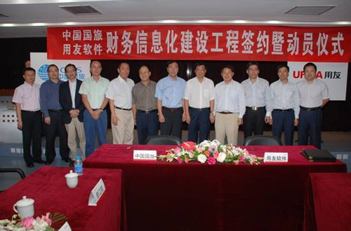 2010年8月27日下午,在中免集團(tuán)10層多功能廳,中國(guó)國(guó)旅和用友公司舉行了‘財(cái)務(wù)信息化建設(shè)工程簽約暨動(dòng)員儀式’,國(guó)旅股份總裁張建華先生和用友公司總裁王文京共同簽署了‘股份公司財(cái)務(wù)信息化項(xiàng)目’的主合同,中免集團(tuán)總經(jīng)理盧路先生與用友公司高級(jí)副總裁吳健先生共同簽署了‘中免集團(tuán)財(cái)務(wù)系統(tǒng)項(xiàng)目’的子合同,合同的簽署,標(biāo)志著中免集團(tuán)‘總部系統(tǒng)項(xiàng)目’建設(shè)工作正式啟動(dòng)并進(jìn)入實(shí)施階段。