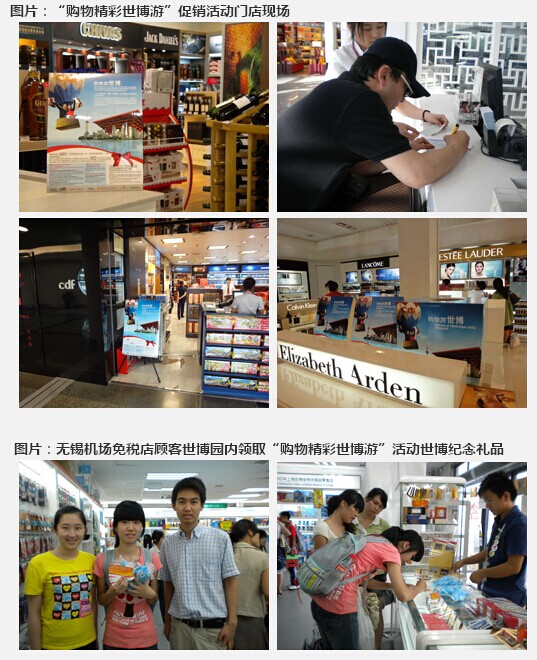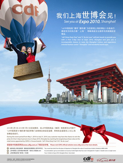 中免集團(tuán)利用2010年上海世博會(huì)所帶來(lái)的商機(jī),聯(lián)合集團(tuán)下屬零售門店及品牌供應(yīng)商進(jìn)行了以“購(gòu)物精彩世博游”為主題的聯(lián)合促銷活動(dòng)?;顒?dòng)歷時(shí)4個(gè)月,從2010年5月1日開始,并于2010年8月31日精彩落幕。