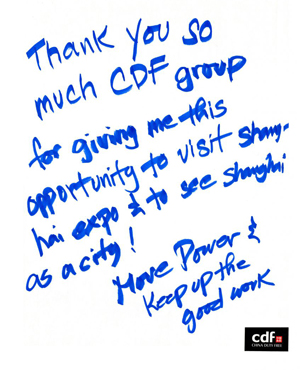 “我家是在菲律賓,每年都會(huì)來(lái)一次廈門,每次都在免稅店買些東西。這次從廈門機(jī)場(chǎng)準(zhǔn)備返程的時(shí)候在免稅店買兩瓶酒還有施華洛世奇飾品準(zhǔn)備送我太太,結(jié)賬的時(shí)候店員介紹我填寫抽獎(jiǎng)卡片,說有機(jī)會(huì)可以中獎(jiǎng)免費(fèi)游世博會(huì),沒想到真的中獎(jiǎng)了。當(dāng)接到中獎(jiǎng)通知電話的時(shí)候感覺很是不可思議,很懷疑‘是真的嗎?’但是當(dāng)中獎(jiǎng)資料文件和世博門票郵寄給我的時(shí)候我才相信這是真的呵呵。”