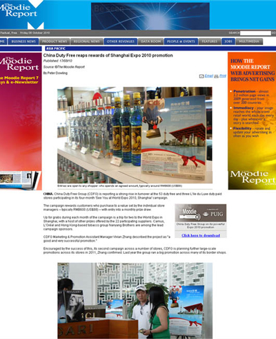 “精彩購(gòu)物世博游”促銷活動(dòng)受到全球免稅權(quán)威雜志穆迪報(bào)告(The Moddie Report)關(guān)注,并以專訪形式在慕迪報(bào)告網(wǎng)站和雜志上刊登了專題報(bào)道。