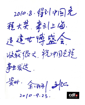 “接到中獎(jiǎng)通知電話的時(shí)候有些以外了,有些不敢相信,不過在聽到工作人員的詳細(xì)介紹后就覺得很開心自己能夠獲得特等獎(jiǎng),隨后又收到了貴公司寄給我的獲獎(jiǎng)通知及合同還有世博會(huì)門票,就覺得做的很細(xì)致,也完全相信了我確實(shí)是這么幸運(yùn)了,非常高興。”