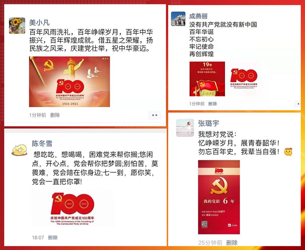 奮斗百年路,啟航新征程。為慶祝黨的百年華誕,激發(fā)黨員群眾愛黨愛國熱情,近日來,公司各級黨組織、團組織積極組織黨員和團員青年開展了形式多樣的主題活動,表達對中國共產(chǎn)黨的無限熱愛和對祖國的美好祝福!