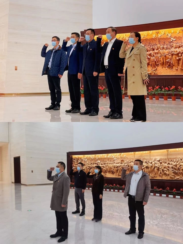 在黨史展覽館紅色大廳,公司黨委班子成員面向黨旗重溫入黨誓詞,重憶入黨初心。