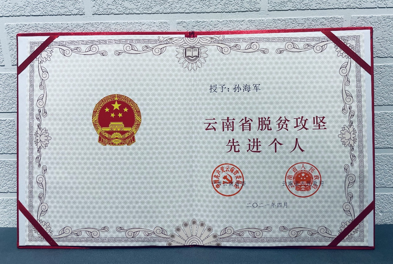 在云南掛職的兩年多時間里,孫海軍同志始終堅持黨的領導,努力加強思想政治學習,堅決貫徹執(zhí)行黨和國家的路線、方針、政策,全身心投入脫貧攻堅工作,堅決落實黨中央決策部署,勤勤懇懇、任勞任怨、盡心盡力地做到統(tǒng)籌安排、精準施策,圓滿完成了各項扶貧工作任務。在2021年四月被授予云南省脫貧攻堅先進個人。